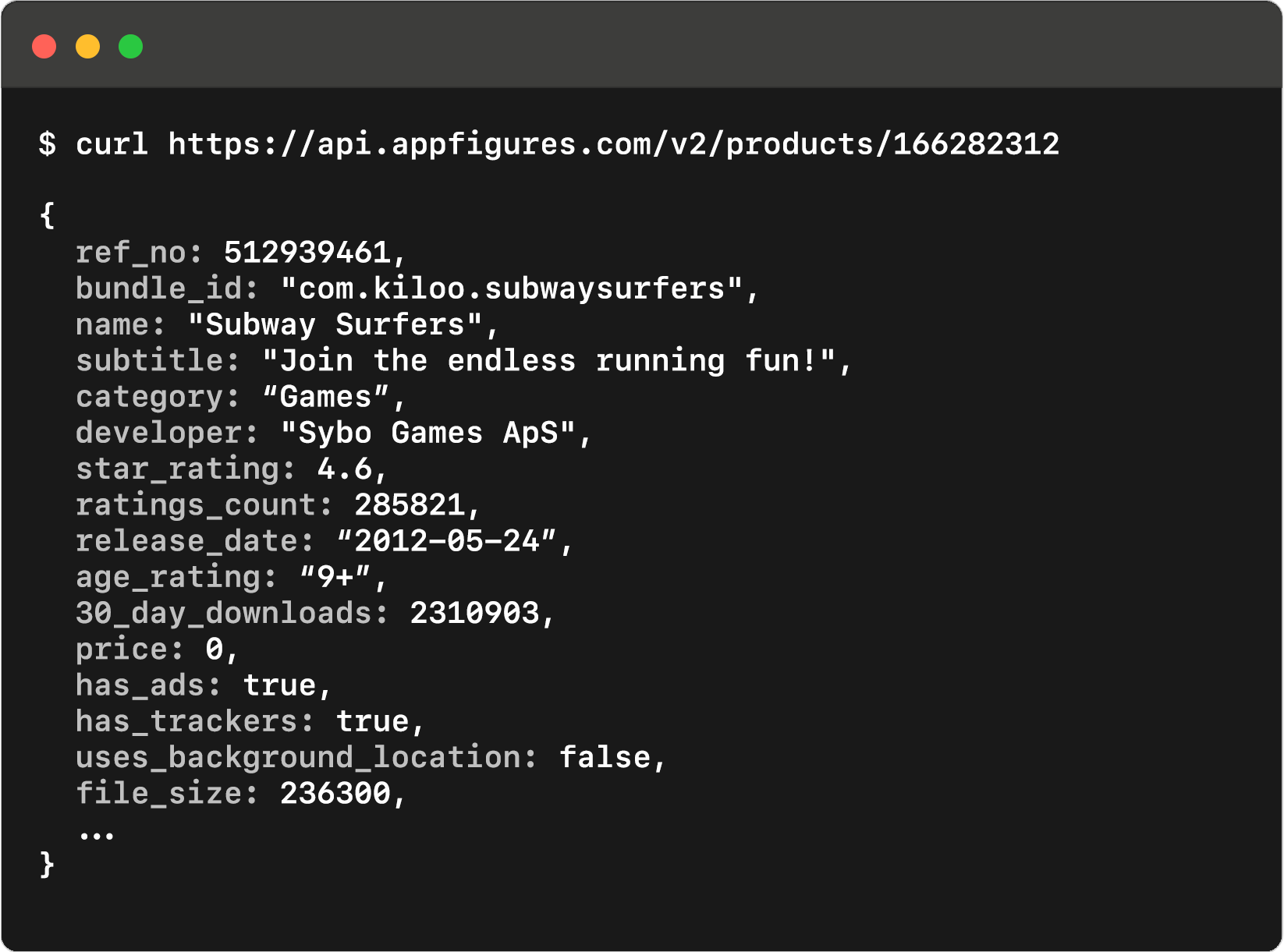 Appbase includes every piece of information available in the store, including metadata such as the app's name, category, and bundle id as well as less easily accessible data such as global reviews and ratings, cross-platform mapping, device compatibility, and lots more.